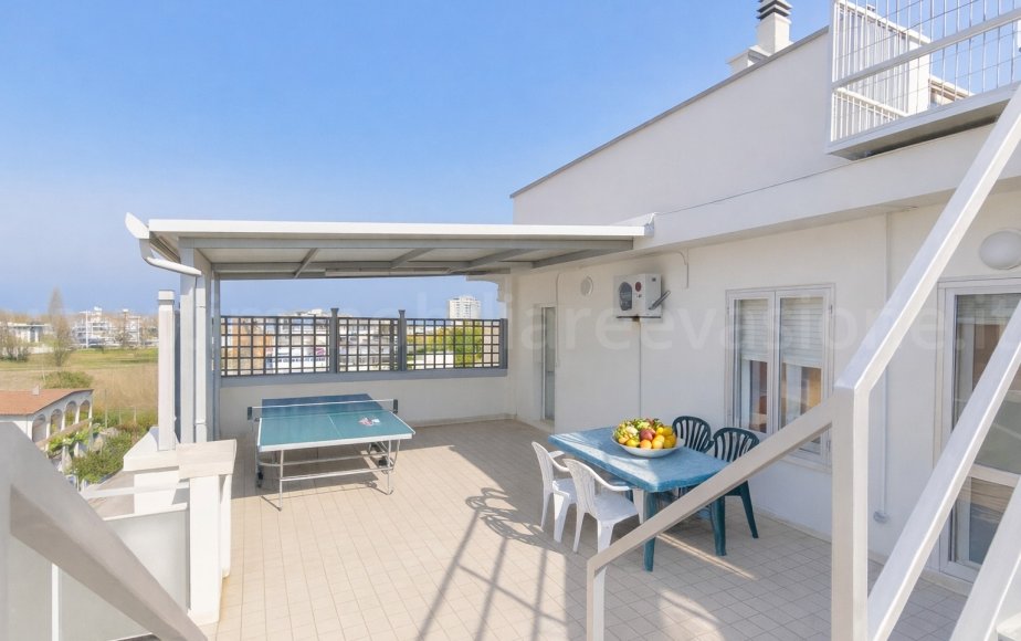 Un attico unico nel suo genere, ideale per chi desidera vivere l’estate in totale relax, con la comodità di avere spiaggia e servizi a pochi passi, ma anche il piacere di vivere in ambienti freschi, ariosi e confortevoli, grazie alla climatizzazione presente in ogni locale.