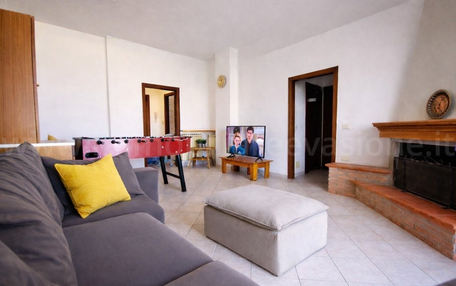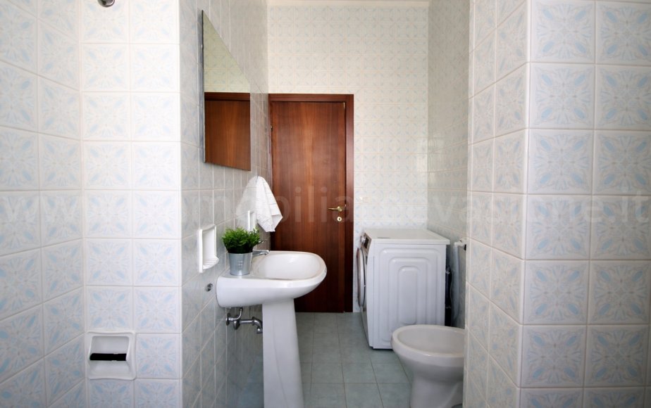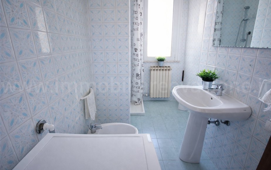 Proseguendo troviamo un comodo disimpegno, un primo bagno di servizio completo e un soggiorno accogliente con due divani confortevoli, di cui uno trasformabile in letto ad una piazza e mezza, ed un affaccio su un balconeche vede uno scorcio di mare,.