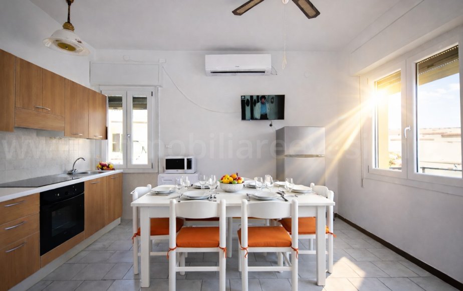 L’appartamento è organizzato in modo pratico e molto confortevole: l’ingresso si apre su una luminosa zona pranzo-soggiorno con cucina lineare a vista, completa di piano cottura elettrico a induzione, forno, microonde, frigorifero con cella freezer, moka elettrica e lavatrice.