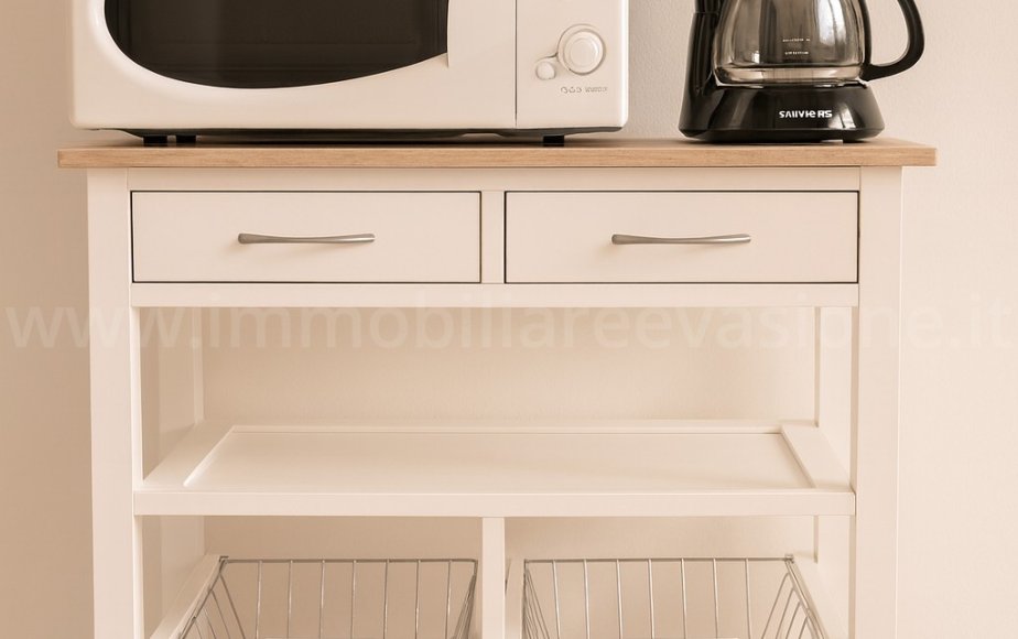Pranzo soggiorno attrezzato con PIANO COTTURA AD INDUZIONE, FORNO A MICROONDE, FRIGORIFERO CON CELLA FREEZER, LAVATRICE.