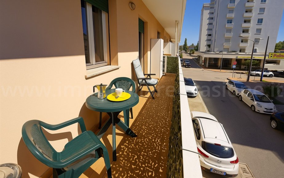 BALCONE VIVIBILE attrezzato con tenda da sole, tavolino e due sedie, ideale per colazioni all’aperto o per rilassarsi la sera con la brezza marina.